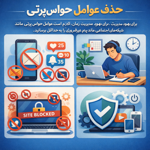 برای بهبود مدیریت زمان، لازم است عوامل حواس پرتی مانند شبکه های اجتماعی یا پیامهای غیرضروری را به حداقل برسانید. استفاده از ابزارهایی مانند برنامه های مسدودکننده سایتهای مزاحم میتواند مفید باشد.