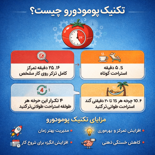 این تکنیک شامل تقسیم زمان کار به بازه های ۲۵ دقیق های (پومودورو) و استراحتهای کوتاه بین آنهاست. این روش به افزایش تمرکز و کاهش خستگی کمک میکند.